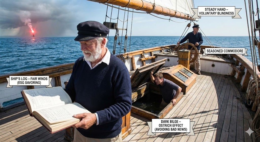 Managing an ESG portfolio is like maintaining a vessel’s seaworthiness. You check the ship’s log with pride after a day of fair winds and smooth sailing (savoring), yet you might avoid peering into the dark of the bilge if you suspect a leak, choosing to preserve a false sense of calm (the ostrich effect). Paradoxically, the most seasoned commodores are often the most prone to ignoring the red flares of an approaching squall or shifting tides (market drops or climate risks). They employ this ‘voluntary blindness’ to keep a steady hand on the tiller, preventing a desperate turn of the wheel or a panicked retreat in the heat of the storm.