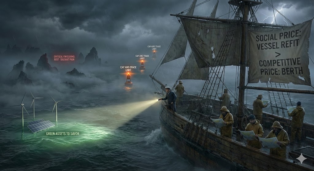 Managing climate change as a public good is like navigating a storm in thick fog. The fog represents uncertainty, which forces us to be robustly cautious and value our options in a nonlinear manner, preparing for the worst-case scenario. Our attention is like a flashlight with limited battery: we only illuminate the most immediate or “pleasant” obstacles (such as green assets we can “savor”), ignoring the distant reef because it lacks the immediate PAIN triggers (Personal, Abrupt, Immoral, Now) that would capture our “finite pool of worry”. To avoid a shipwreck, it is insufficient for every sailor to consult their own chart (Nash equilibrium). In this context, mechanisms like Cap-and-Trade act as buoys marking the channel’s limit: while they do not tell us exactly how much the “fuel” (the price of allowances) will cost to avoid them, they ensure the ship does not run aground on the reef of critical emissions. Indeed, the true cost of refitting the vessel for all hands (social price) will always exceed what each sailor is willing to pay individually for their own berth (competitive price).